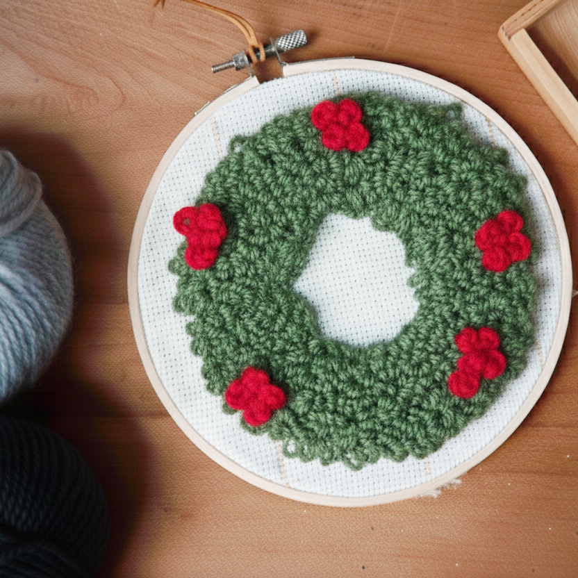 パンチニードル刺繍でクリスマスリースをつくろう(d) Neutuft(ノイタフト) 布に毛糸を刺して模様をつくる「パンチニードル刺繍」でクリスマスリースをつくります。10歳以上〜大人材料費:1,000円 つちやひさと文京区でラグづくりのワークショップを企画・運営しています。