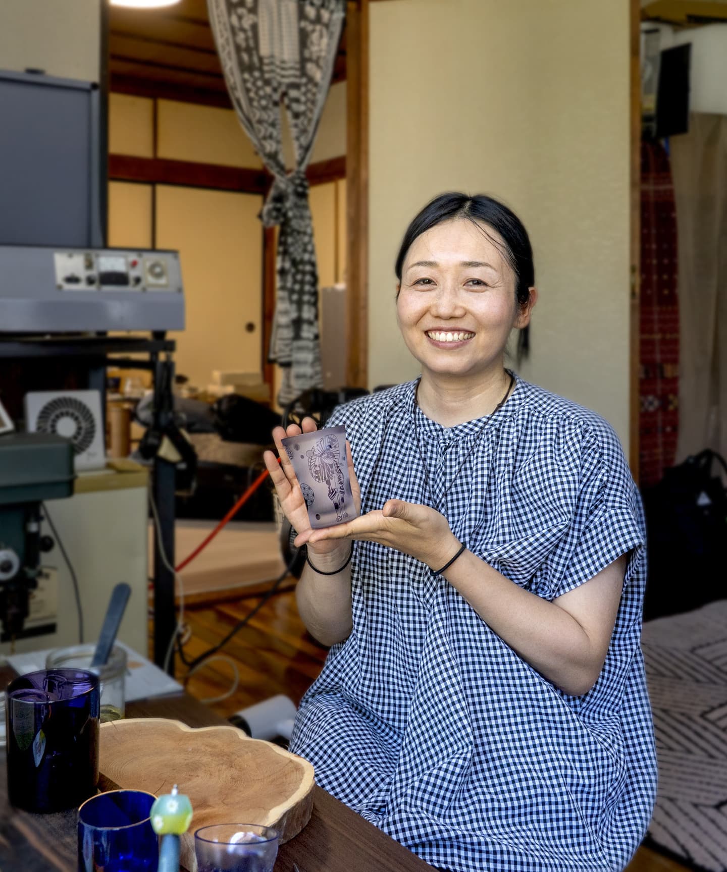 nijiirosketch主宰。文京区音羽在住。女子美術大学で建築を学び、卒業後は大工となる。その後、ガラス工芸職人を志して技術を学び、名入れ彫刻の職人を経て、nijiirosketchとして創作活動を開始。サンドブラストによる記念品やグラスの彫刻をはじめ、吹きガラス、バーナーワーク、キルンワークなど、多彩な技法を駆使し、心躍るガラス作品を創作している。