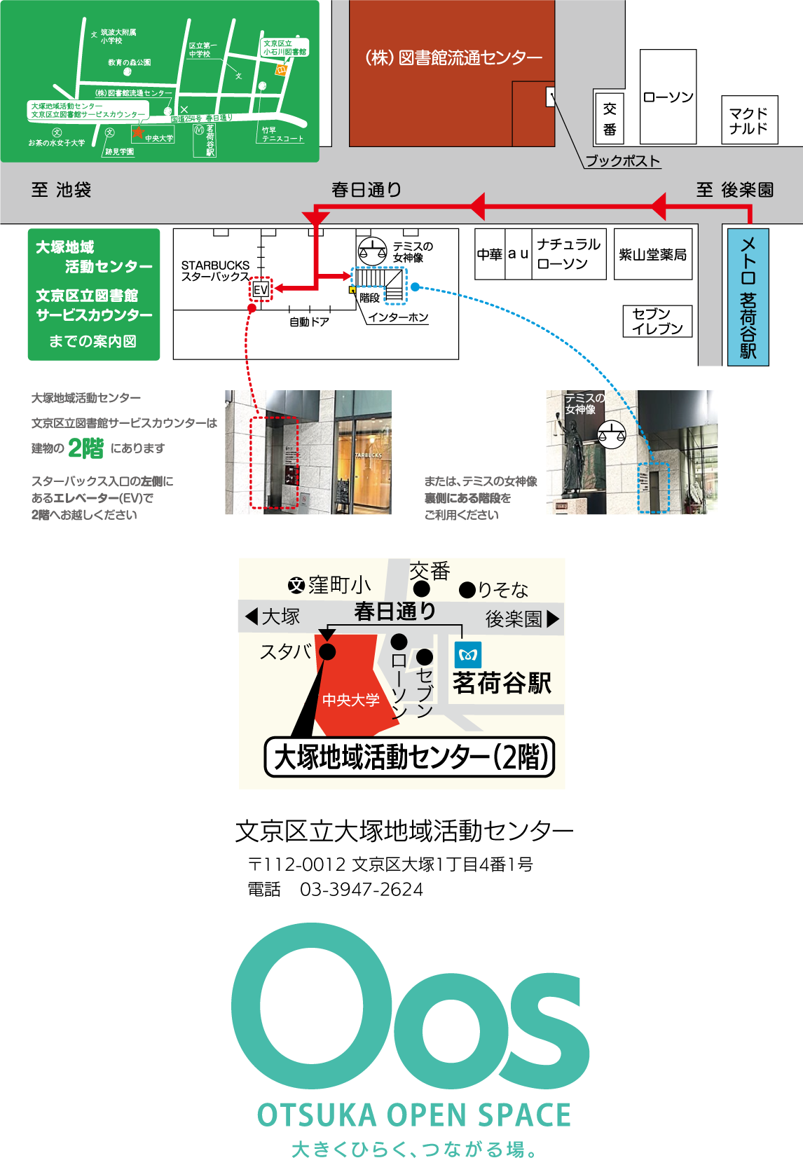 Oos クラフェス会場:大塚地域活動センター・オープンスペース(Oos)について 大きくひらく、つながる場。 〒112-0012 文京区大塚1-4-1 中央大学 茗荷谷キャンパス2階 大塚地域活動センター・オープンスペース(Oos)は、茗荷谷駅前にできた中央大学茗荷谷キャンパスの2階にある文京区のスペースです。Oosは、地域団体や住民の相互交流の場や、顔の見える関係づくりを目的としたイベント等をおこなう「みんなでつくる場所」です。入り口が見つかりにくいので注意が必要で、中央大学校舎内には入らず、スタバ入り口脇のエレベーターで2階にお上がり下さい。 mTOALK ,5f38b30f-1091-4537-a28b-5646ac4b362f,,{"tempId":"gdefault","gmapWidth":"100","gmapWidthUnit":"%","gmapHeight":"450","gmapHeightUnit":"px","gmapZoomLevel":15,"gmapScrollWheel":true}
